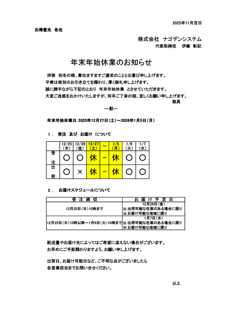 本年もナゴデンシステムをご愛顧いただき、誠にありがとうございました。